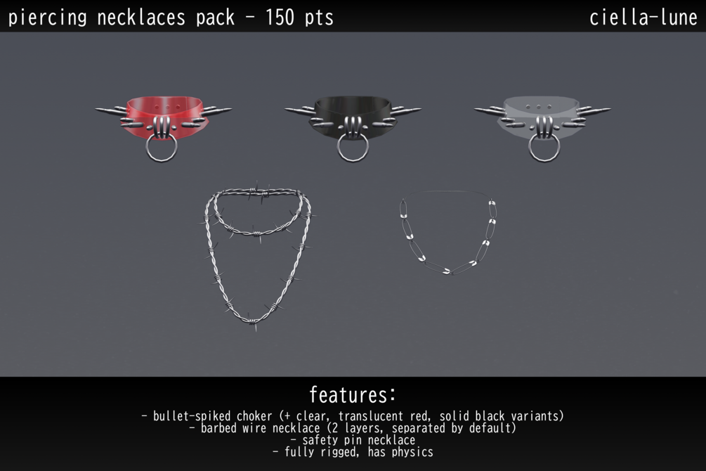 a set of necklaces in .pmx format intended for mmd models, for use in mmd or modelling softwares (i.e: maya, blender, etc) for the purpose of editing, (re)modelling, or rendering only. credit ciella-lune if using.